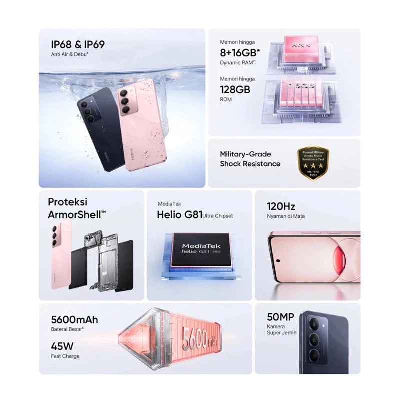 * Punya sertifikasi IP68 dan IP68 yang membuatnya tahan debu dan air, serta tahan air bersuhu dan bertekanan tinggi